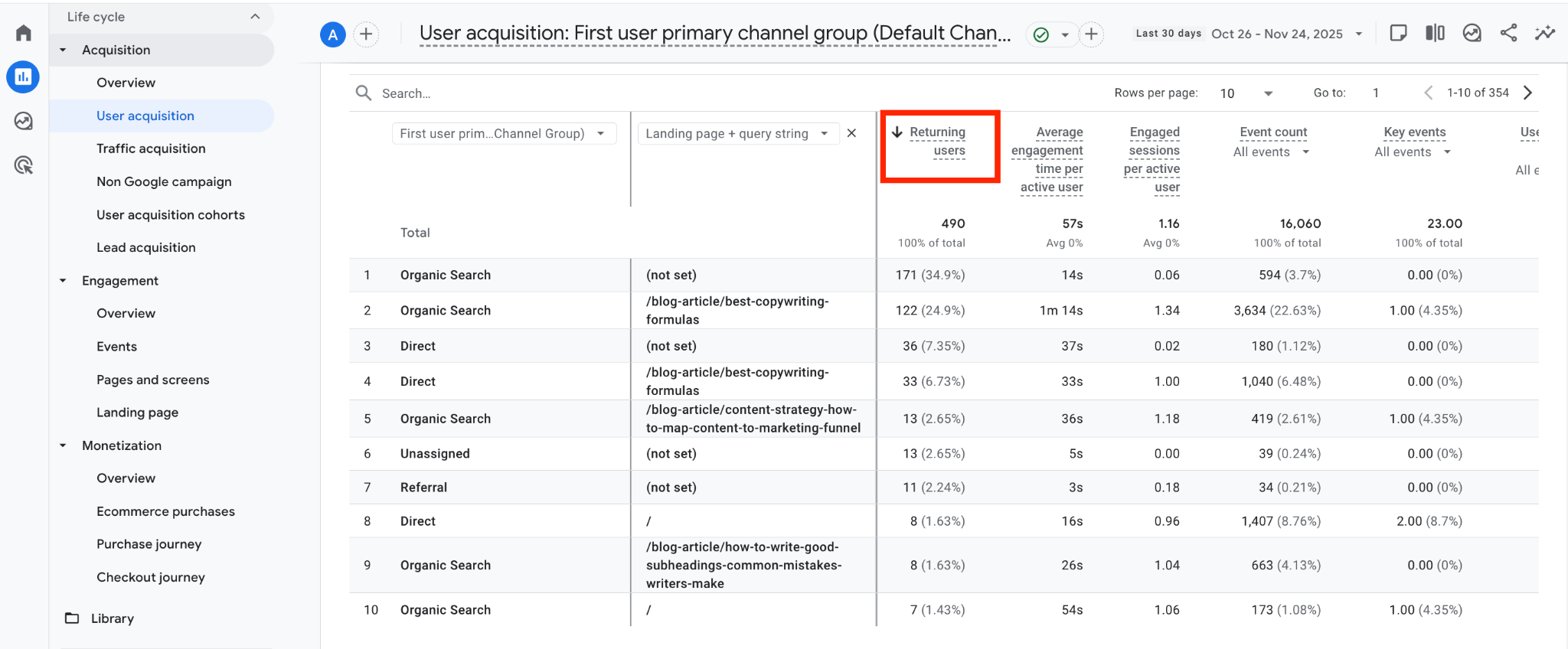 The opportunity to explore: Some pages might already be driving more returning visitors than others. What if we could identify and optimize these pages?