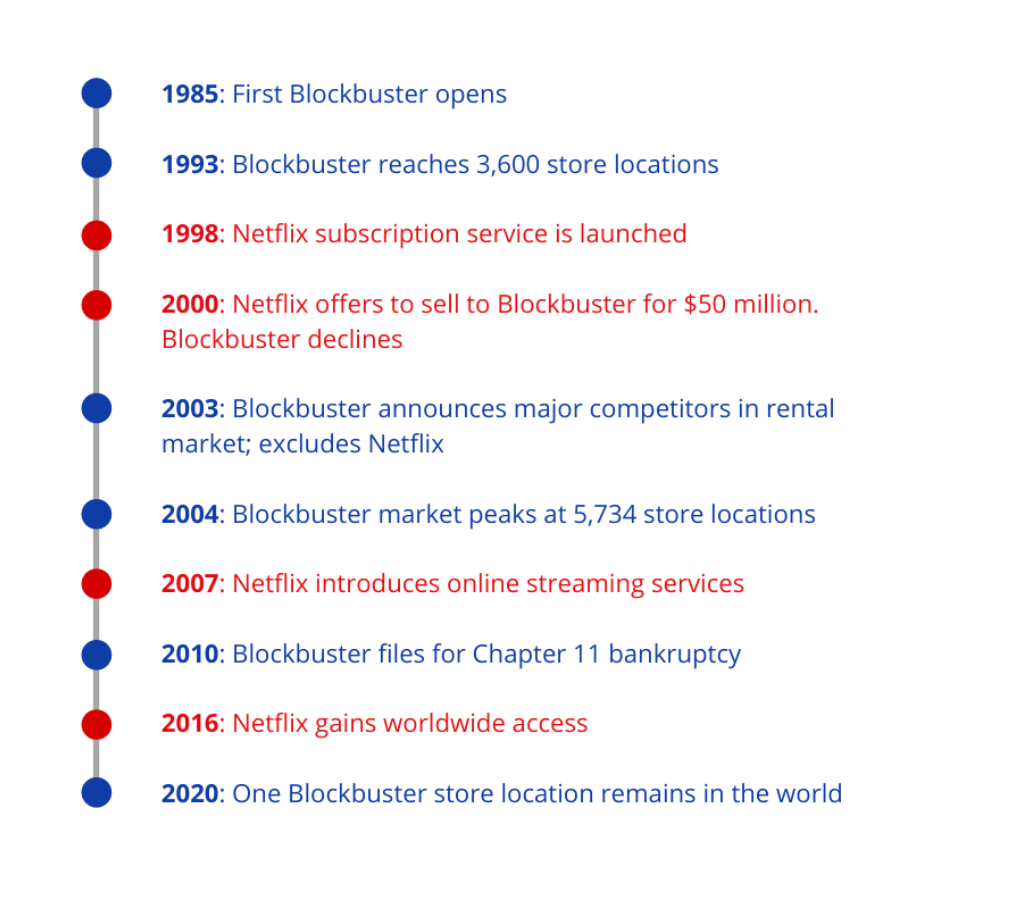 Netflix and Blockbuster made history. In 2000, founders of Netflix wanted to sell their struggling DVD-by-mail startup to Blockbuster for $50 million. But Blockbuster's CEO John Antioco laughed at this offer. We all know how that ended.